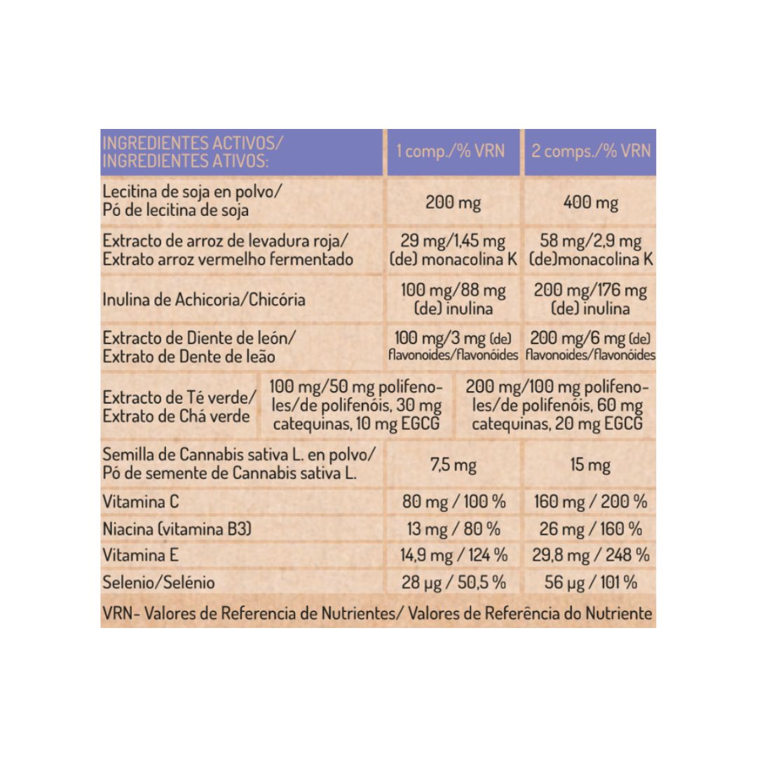 NRV - Nutrient Reference Values Warnings: Os suplementos alimentares não devem ser utilizados como substitutos de uma dieta variada e equilibrada ou de um estilo de vida saudável. Não exceda a dose diária recomendada. Manter fora do alcance de crianças pequenas. Não consuma a quantidade diária de 3 mg de monacolinas de arroz fermentado com levedura vermelha ou mais ou a quantidade diária de 800 mg ou mais de (–) epigalocatequina 3-galato (EGCG). Não consumir por mulheres grávidas ou a amamentar, com menos de 18 anos de idade ou mais de 70 anos de idade. Procure aconselhamento médico sobre o consumo deste produto se tiver algum problema de saúde. Não consuma se estiver a tomar medicamentos para baixar o colesterol. Não consuma se já estiver a consumir outros produtos que contenham levedura vermelha, arroz ou chá verde. Não tome com o estômago vazio. O consumo excessivo pode causar desconforto intestinal. Evite o consumo com medicamentos e outros suplementos alimentares à base de fibras. Armazenar em local fresco e seco, longe de qualquer fonte de calor ou luz direta. Ingredientes: agente